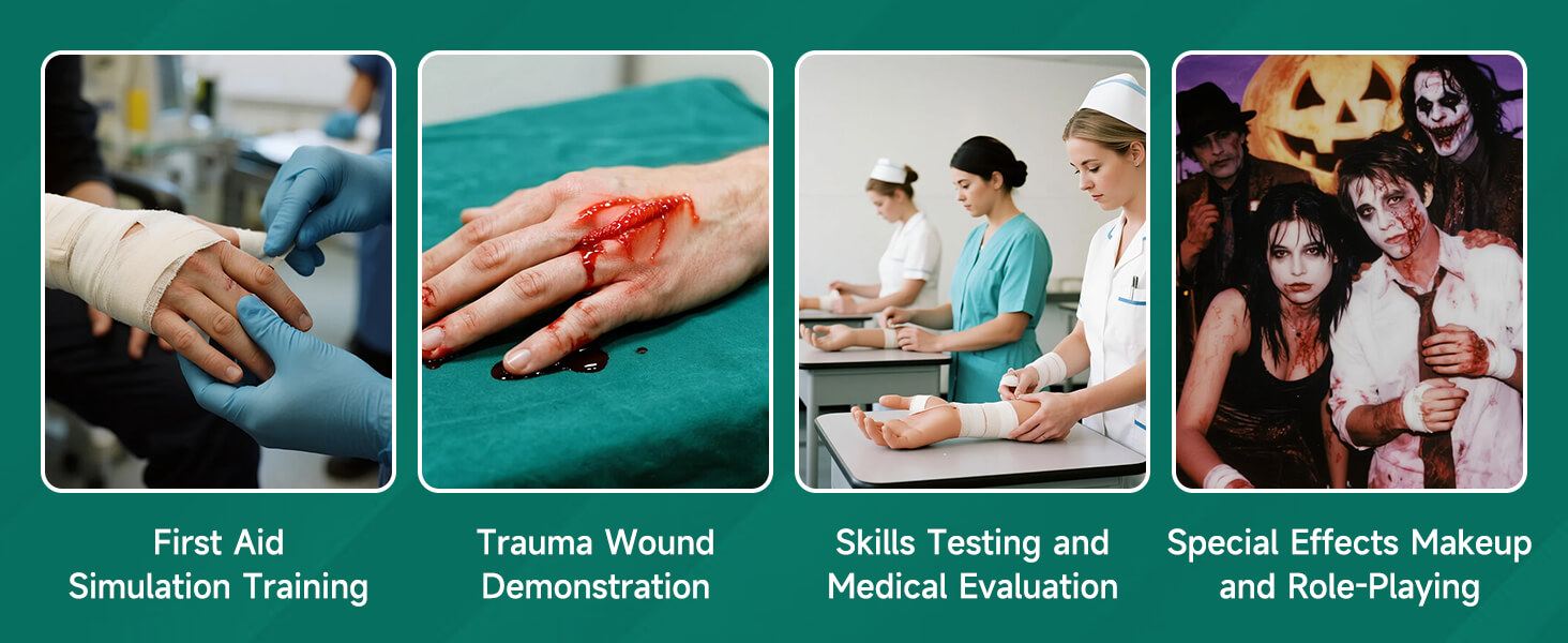 Ideal für EMT- und Pflegeausbildung sowie für SFX-Make-up, Halloween-Kostüme, Filmrequisiten und Theateraufführungen.