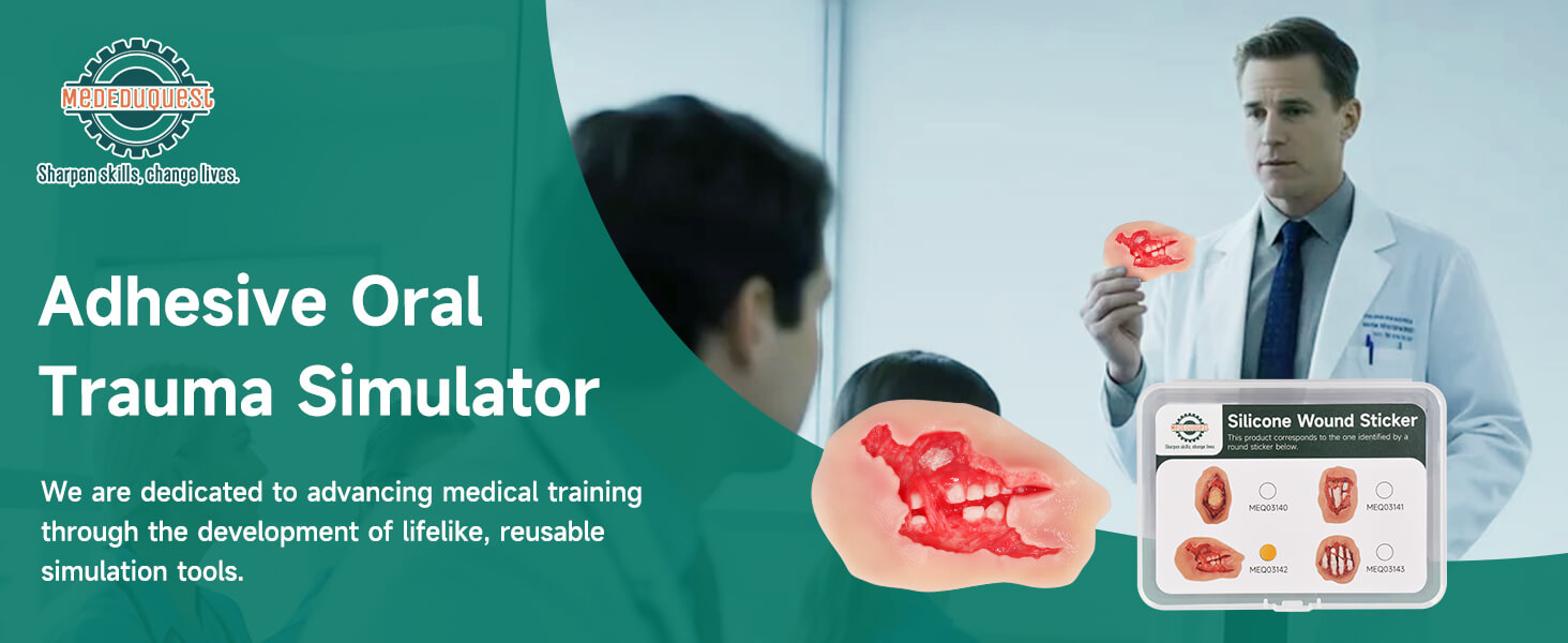 The adhesive oral trauma wound model provides a detailed simulation of maxillofacial injuries, including gingival laceration, exposed tooth root, and lip corner burn. It offers high fidelity for oral wound care training, first responder education, and dental trauma management. Self-adhesive and reusable, it adheres easily to mannequins or human skin for practical application in both clinical and field-based scenarios.
