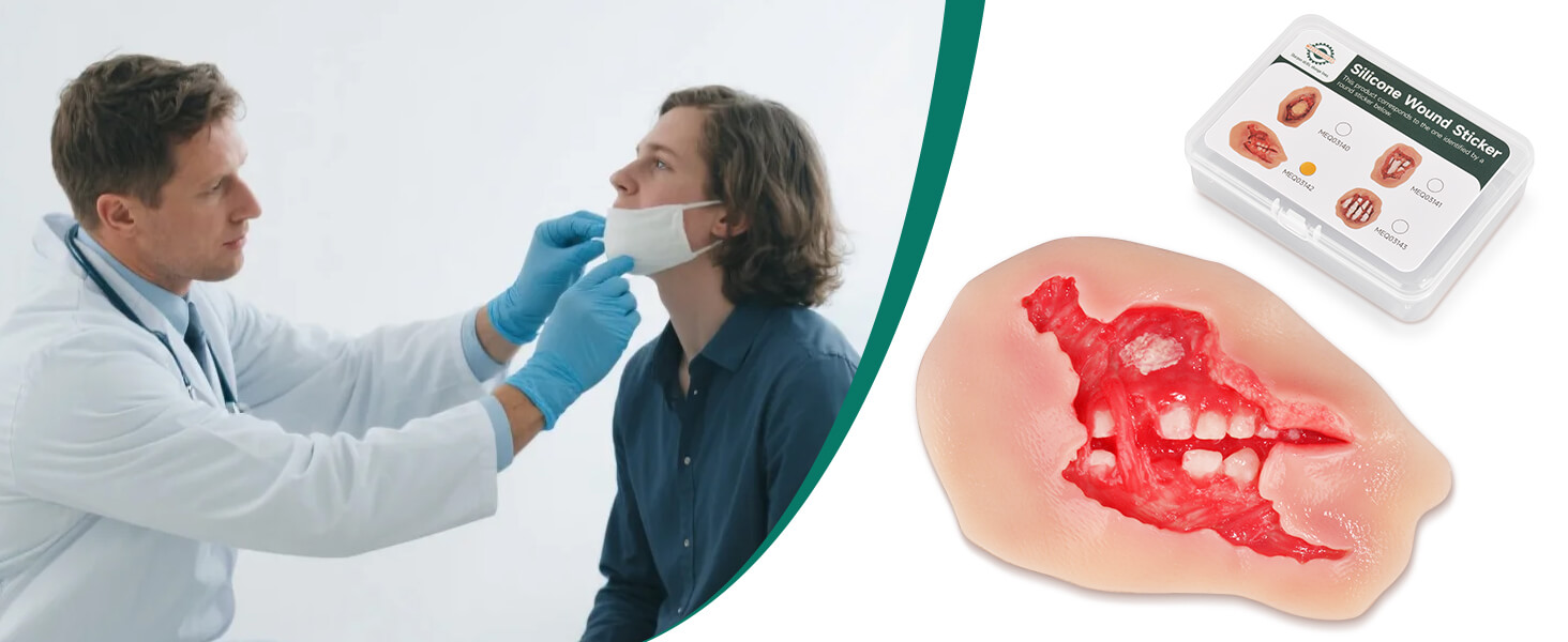 Accurately replicates facial trauma with exposed tooth root, gingival avulsion, and corner mouth tear, ideal for practicing complex oral wound management.